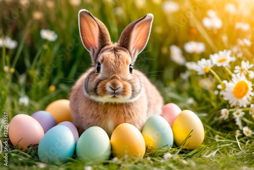 Cute Easter rabbit with colorful eggs and spring flowers on green grass at sunny day. Little bunny in the meadow. Happy Easter celebration concept. Design for banner, greeting card, postcard