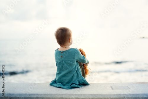 cute european baby toddler in a green dress with a doll sits on a stone bench by the sea, gray background. A girl plays with a doll, a view from the back, sad negative emotions