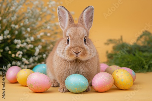 Cute fluffy Easter rabbit with colorful painted eggs on a vibrant backdrop, room for text