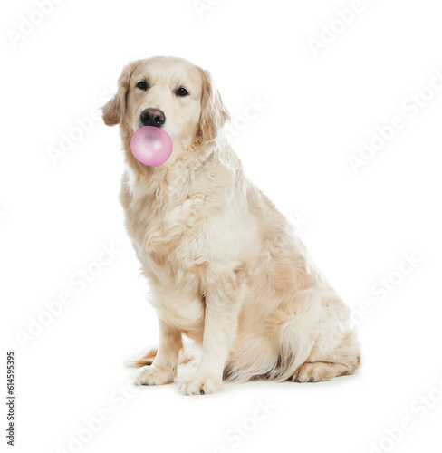 Cute Golden Retriever dog with bubble of chewing gum on white background