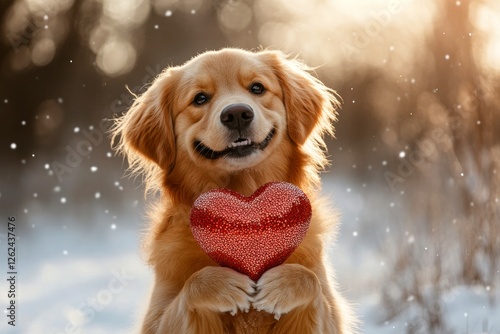 Cute golden retriever dog with sparkling rhinestones red heart on a walk in a winter green space. Golden retriever - my beloved dog, symbol of friendship. Commercial companion creative design ide.