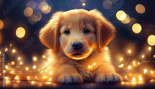 cute golden retriever puppy surrounded by twinkling fairy lights