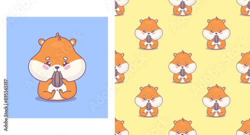 Cute hamster eats seed. Seamless pattern with funny cartoon rodent kawaii character on yellow. Isolated card and background. Vector illustration. Kids collection