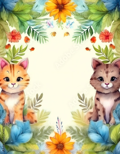 Cute illustrated cats surrounded by colorful flowers and leaves, perfect for stationery.