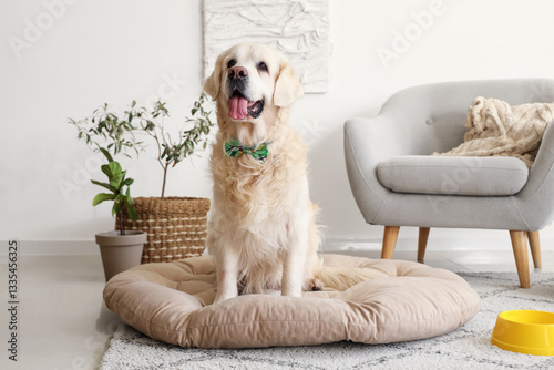 bed, bow, cute, dog, home, labrador, pet, attaching, accessory, adorable, animal, background, beautiful, beige, big, breed, care, colours, comfort, companion, creature, doggy, domestic, educated, friends, friendly, fun, funny, fur, gold, hair, happy, indoor, lifestyle, lovely, mammal, pedigree, playful, portrait, relax, rest, retriever, sitting