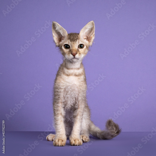 Cute Lilac tortie tabby spotted LaPerm cat kitten, sitting facing front. Looking towards camera. Isolated on purple bakground.