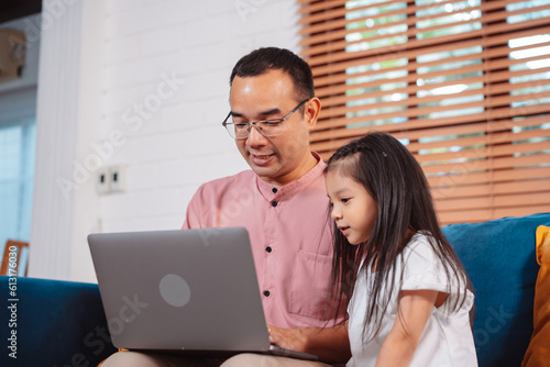 Cute little asian daughter with father working on laptop at home. single loving dad man shopping insurance to daughter by online technology.