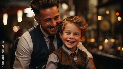 Cute little boy is getting haircut by hairdresser at the barbershop