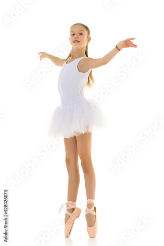 Cute little girl in a tutu and pointe shoes dancing in the studio on a white background.