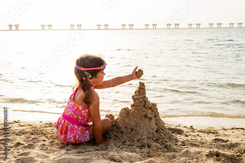 Cute little girl playing with sand and building sandcastle on the beach in Dubai