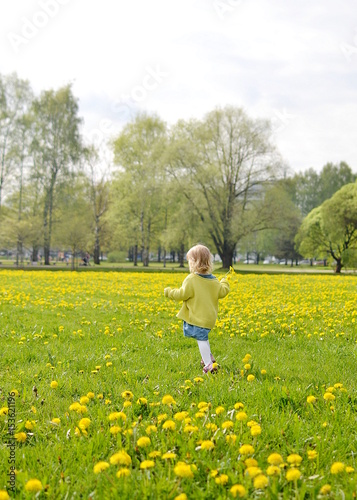 Cute little girl walking in the park with dandelion flowers