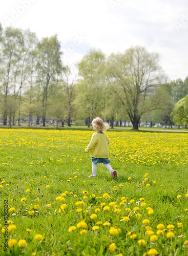 Cute little girl walking in the park with dandelion flowers
