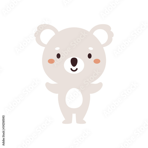 Cute little koala on white background. Cartoon animal character for kids cards, baby shower, invitation, poster, t-shirt composition, house interior. Vector stock illustration