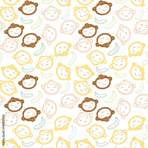 Cute Monkeys and Bananas Seamless Pattern. Playful Monkey Heads Pattern Fabric Motif Illustration.