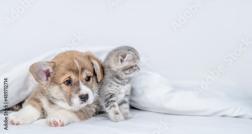 Cute Pembroke welsh corgi puppy and gray kitten sit together under warm blanket on a bed at home and look away on empty space