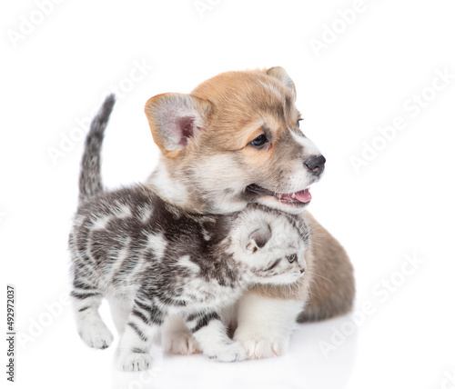 Cute Pembroke welsh corgi puppy and tiny kitten sit together and look away on empty space. isolated on white background