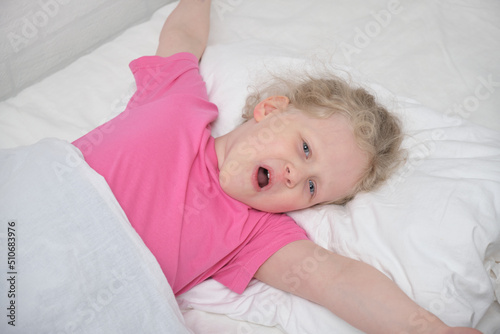 Cute preschooler girl yawns and stretches in bed