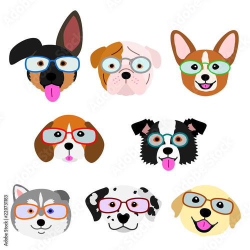 vector, illustration, animal, pet, dog, puppy, face, eyeglass, set, group, head, german shepherd dog, labrador retriever, beagle, bulldog, siberian husky, border collie, smiling, cute, front, element, character, collection, cartoon, white background, pet shop, design, hipster, study, school