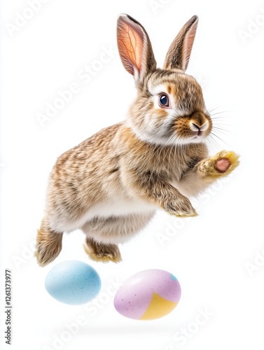 Cute rabbit jumping surrounded by floating colorful Easter eggs isolated on white background.