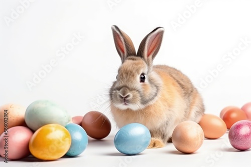cute rabbit surrounded by colorful Easter eggs on a white background created with Generative AI technology