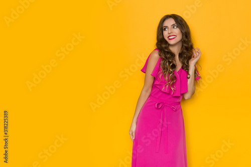 woman, pink, dress, cute, looking away, happy, smiling, elegant, watching, vitality, copy space, fashionable, modern, magenta, enjoy, beautiful, portrait, long hair, brown hair, yellow background, fashion, colours, positive, attractive, pretty, lady, cheerful, femininity, girl, slim, young, adult, studio, people