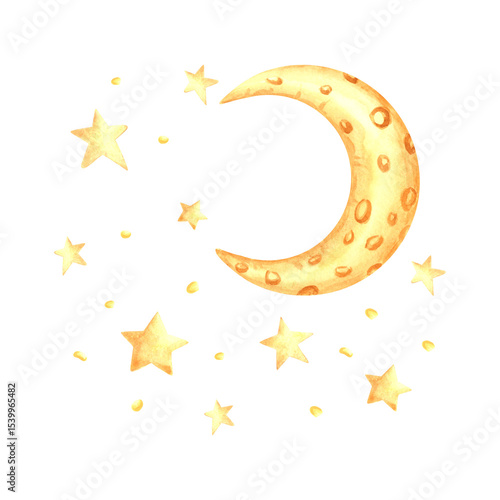 Cute yellow crescent moon with stars watercolor illustration for kids design. Isolated hand drawn selestial satellite. Decoration element for design of baby fairy dreams. Clipart for childrens theme.