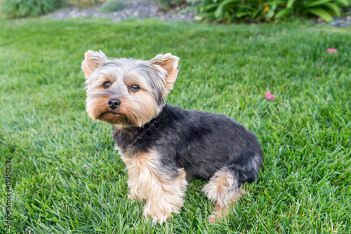 Cute Yorkshire Terrier Dog on green grass. Yorkie