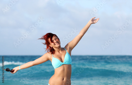 Cute young redhead woman smile and enjoy sun on the ocean shore