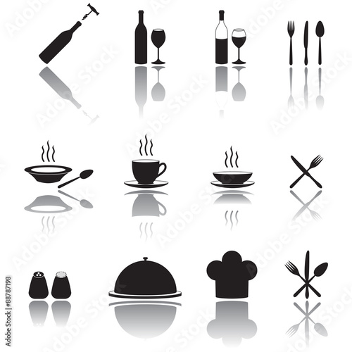 icon, isolated, dish, meal, cafes, pepper, plate, kitchen, white, hat, bowl, bar, hot drink, drink, vector, serve, salt, symbol, cup, breakfast, eatery, utensil, service, salad, wine, chef, black, spoon, soup, waiter, tea, dinner, illustration, bottle, collection, lunch, design, knife, cafeteria, cook, set, menu, background, silhouette, cooking, waitress, food, glasses