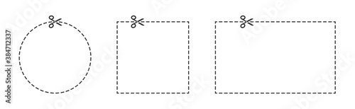Cutting scissors set. Dotted coupon border. Scissors silhouette in white backgroun. Dashed discount symbol. Dotted circle, square and rectangle. Isolated outline discount. Vector EPS 10.