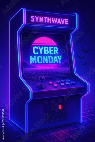 cyber, monday, arcade, neon, retro, 80s, futuristic, game, sale, digital, technology, shopping, glow, nostalgia, electronic, promotion, marketing, design