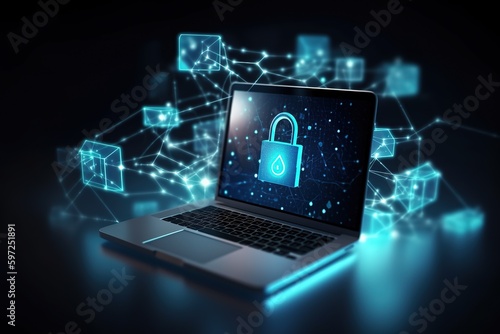 Cyber security, data protection, cyberattacks concept on blue background. Database security software development. Online security concept. Laptop protected with shield. AI