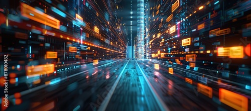 city landscape, futuristic, glowing, light, speed, digital, illustration, neon, city, night, urban, technology, abstract, background, design, art, graphic, modern, style, concept, future, virtual, reality, landscape, architecture, dynamic, colourful, bright, blue, orange, dark, street, path, motion, blur