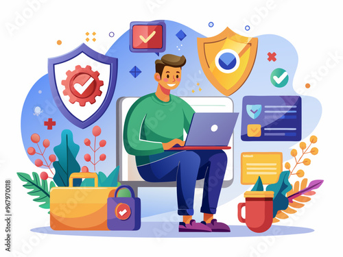 Cybersecurity and Data Protection Vector Art of Online Security with Shield Icons on White Background