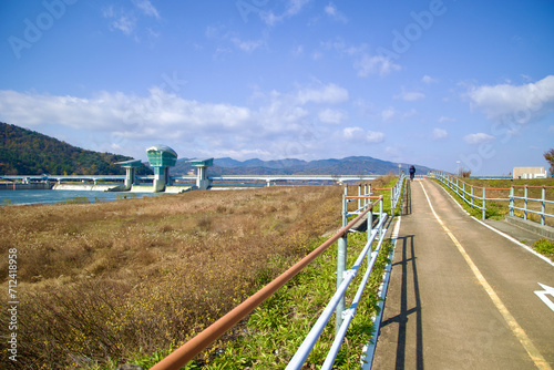 fisheye, panoramic view, peaceful, travel, nature, bike path, scenic, korea, blue skies, renewable energy, cycling, natural beauty, sightseeing, mountain, fence, south korea, landscape, avocation, bicyclist, tranquil, ecotourism