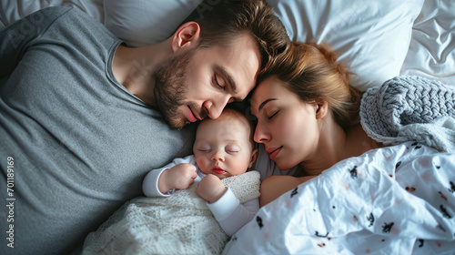 dad mom and baby sleeping in morning at cozy white room