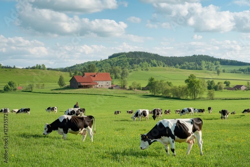 Dairy cows grazing in a beautiful countryside landscape rural area photography green fields wide angle view emphasizing dairy farming's harmony with nature