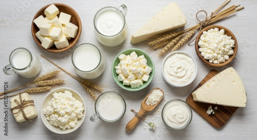 Dairy product array milk in glassespitchers cheese chunks cottage cheese in bowls wheat shafts and yogurt arranged on a white wooden table