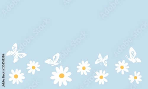 Daisy flower icon set and butterfly cartoons on blue background vector.