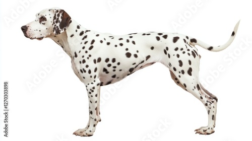 dalmatian, dog, isolated, white, background, animal, pet, mammal, canino, domestic, breed, spotted, profile, looking, standing, furry, fur, tail, ear, snout, black, colours, illustration, photo, cute, playful, friendly, loyal, family, young, adult, nature, portrait, studio, visual, art, design, concept, optical, advertising, marketing, lifestyle, creativity