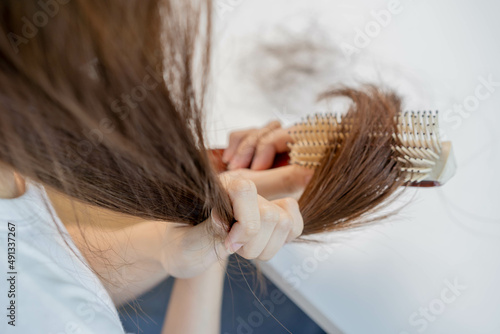 Damaged Hair, frustrated asian young woman, girl hand in holding brush splitting ends messy while combing hair, unbrushed dry long hair. Health care beauty, portrait isolated on white background.