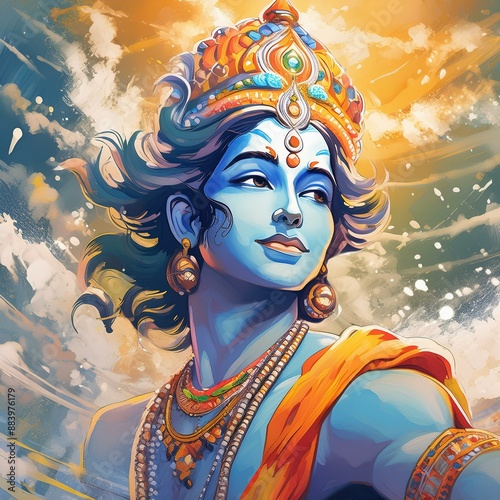 krishna, painting, vishnu, digital artwork, lord, blue, long hair, model, make-up, beauty, face, carnival, paint, person, people, traditional, red, hair, new, ai, hindu, om
