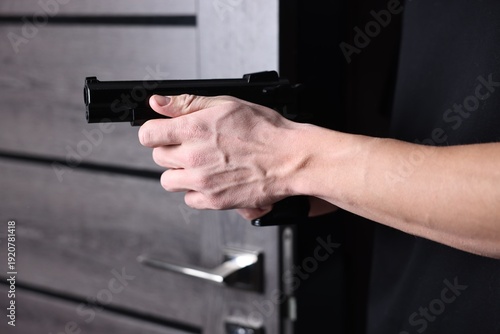 Dangerous criminal holding gun indoors, closeup. Armed robbery