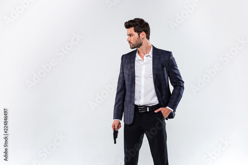 Dangerous style. Handsome young man looking away and holding a gun while standing against white background