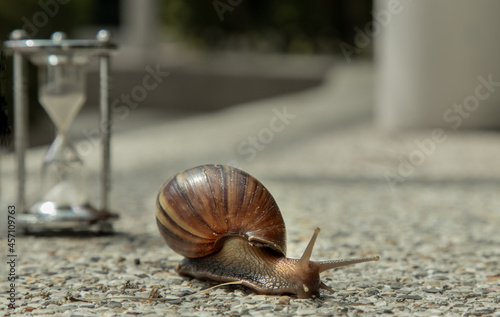 Dark achatina snail with Dark shell crawling on the Stone floor near Hourglass. Deadline concept and Slow current time.