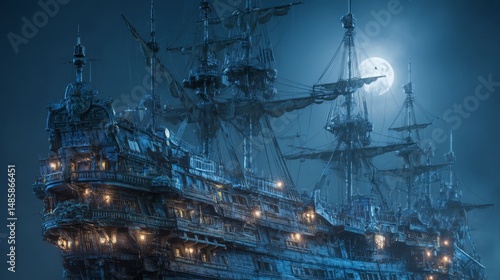 ship, sailing, moon, night, sky, vintage, mystery, ocean, sea, adventure, travel, water, exploration, history, light, shadow, wave, nautical, fantasy, structure, maritime, atmospheric, dark, environment, landscape, blue, illumination, horizon, weather, storm, fog, scene, eerie, twilight, breathtaking, silhouette, distance, scenic, art, design, journey, magic, imagination, coast, tradition, dream, wood, craftsmanship