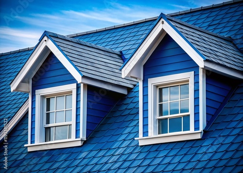 Dark Blue Roof with White Dormer Windows - Macro Architectural Detail Stock Photo