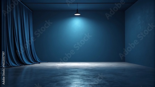 studio, dark blue, background, curtain, spotlight, empty, room, interior, minimalist, stage, theatrical, moody, deep blue, modern, simple, clean, lighting, indoor, textured, shadow, illumination, empty space