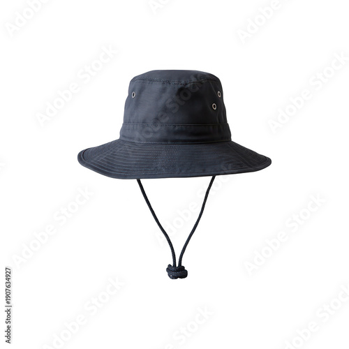 Dark blue wide brim sun hat with eyelets and adjustable chin cord for outdoor activities