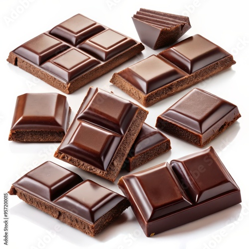 Dark Chocolate Bar Pieces, White Background, Food Photography, Delicious, Sweet, Cocoa